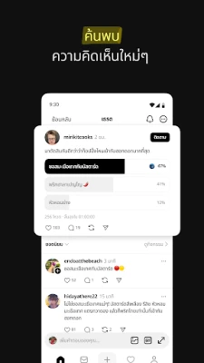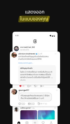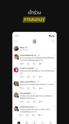 Threads ชวนคุณก้าวเข้าสู่มิติใหม่แห่งการสนทนา ที่ซึ่งทุกหัวข้อที่คุณหลงใหลและทุกกระแสที่คุณอยากตามทันมารวมกันเป็นหนึ่งเดียว ไม่ว่าจะเป็นความสนใจเฉพาะทางไปจนถึงเรื่องราวระดับโลก คุณจะได้พบกับพื้นที่ที่เปิดกว้างสำหรับการแลกเปลี่ยนความคิดเห็น การแบ่งปันแรงบันดาลใจ และการสร้างสรรค์สิ่งใหม่ๆ เชื่อมโยงกับครีเอเตอร์ที่คุณชื่นชอบและผู้คนที่มีความหลงใหลเดียวกัน หรือเริ่มต้นคอมมูนิตี้ของคุณเองเพื่อเผยแพร่เรื่องราวและไอเดียสุดพิเศษสู่สายตาชาวโลก